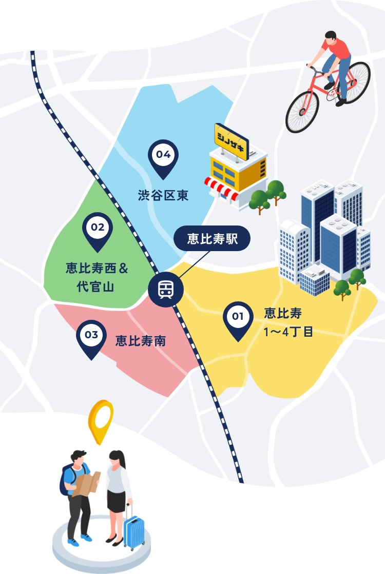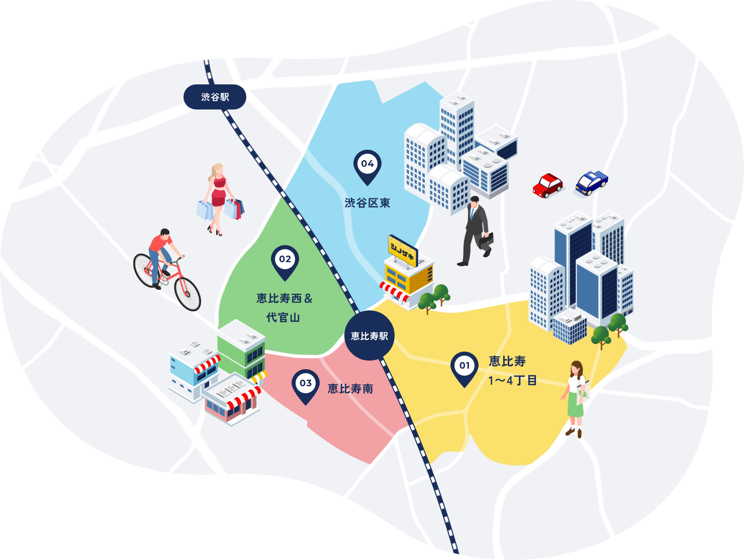 再開発が進む恵比寿1〜4丁目には、多様な企業が集まりビジネスと都市生活が調和した注目のエリアです。